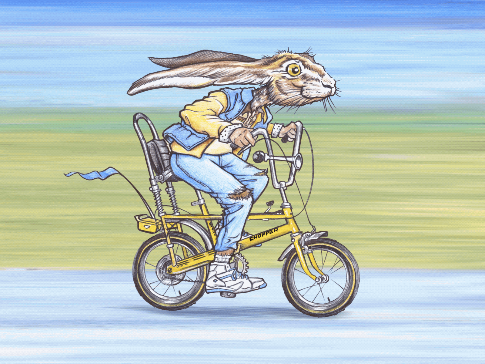 A fun animation created for social media. A Hare racing at high speed on a retro Raleigh Chopper bicycle.